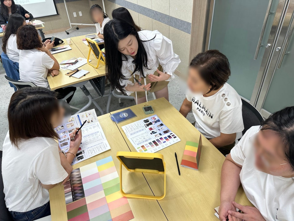 이론 강의 이후에는 참가자분들이 직접 퍼스널컬러 키트지를 활용하여 자가진단을 시도하였고, 옆자리와 비교하며 서로의 결과를 확인하는 시간을 가졌습니다. 이러한 참여형 프로그램은 강연장의 분위기를 한층 더 활발하게 만들었으며, 이어서 대표님께서 각 참가자의 세부 타입을 꼼꼼하게 진단해드리며 보다 정확한 결과를 제공하였습니다.